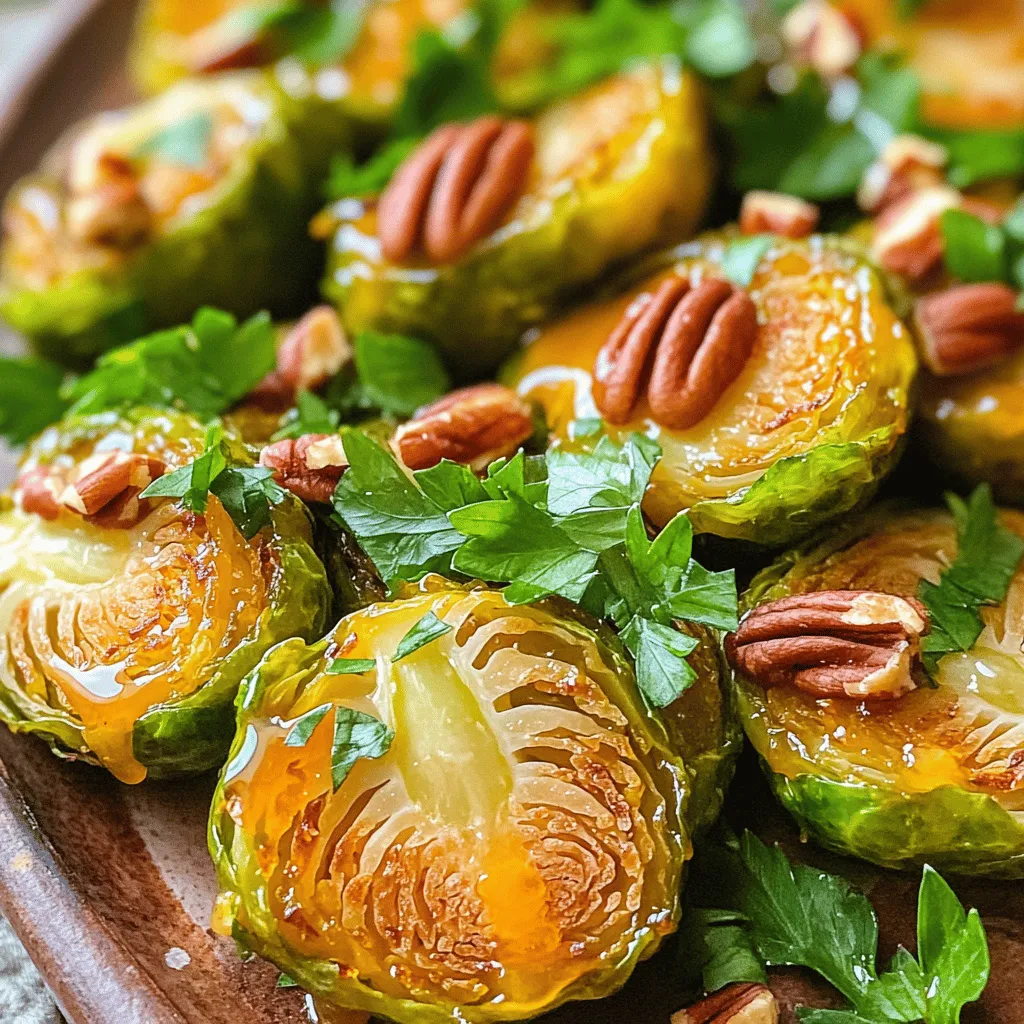 In den letzten 5 Minuten des Röstens gebe ich 30 g gehackte Pekannüsse dazu. Sie bekommen einen tollen Crunch. Nachdem der Rosenkohl fertig ist, nehme ich das Backblech aus dem Ofen. Ich übertrage die gerösteten Rosenkohl-Hälften und Pekannüsse auf eine Servierplatte. Dann garnieren ich alles mit frisch gehackter Petersilie. Das sieht nicht nur schön aus, sondern sorgt auch für mehr Geschmack.