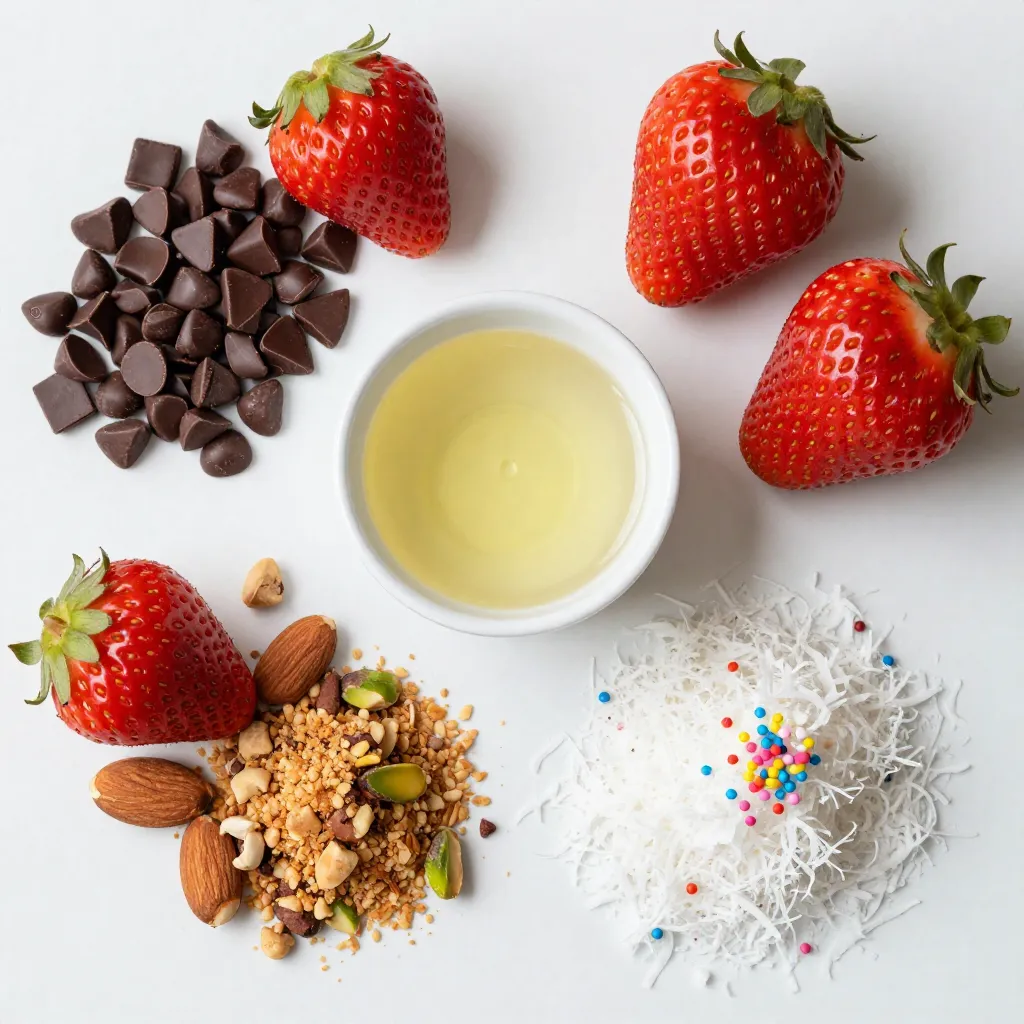Die Hauptzutaten sind einfach. Du brauchst frische Erdbeeren, die saftig sind. Die Zartbitterschokolade sorgt für einen reichen Geschmack. Das Kokosöl macht die Schokolade glatt und glänzend. Holzstäbchen helfen dir, die Erdbeeren einfach zu halten.