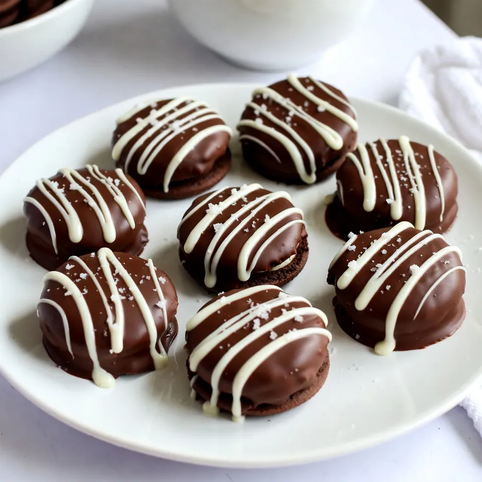 - Drizzeln und Garnieren: Nachdem die dunkle Schokolade fest geworden ist, drizziere die geschmolzene weiße Schokolade in einem Zickzack-Muster über die Oreos. Wenn gewünscht, streue eine Prise Meersalz auf jeden Keks für einen süß-salzigen Kontrast.