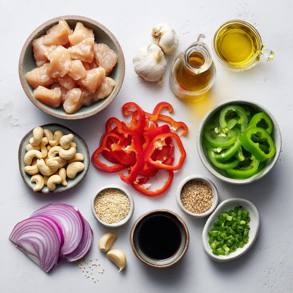 Die Hauptzutaten sind einfach und frisch. Ich bevorzuge Hühnerbrust, weil sie schnell gart. Cashews geben diesem Gericht einen knusprigen Biss. Paprika und Zwiebeln bringen Farbe und Geschmack.