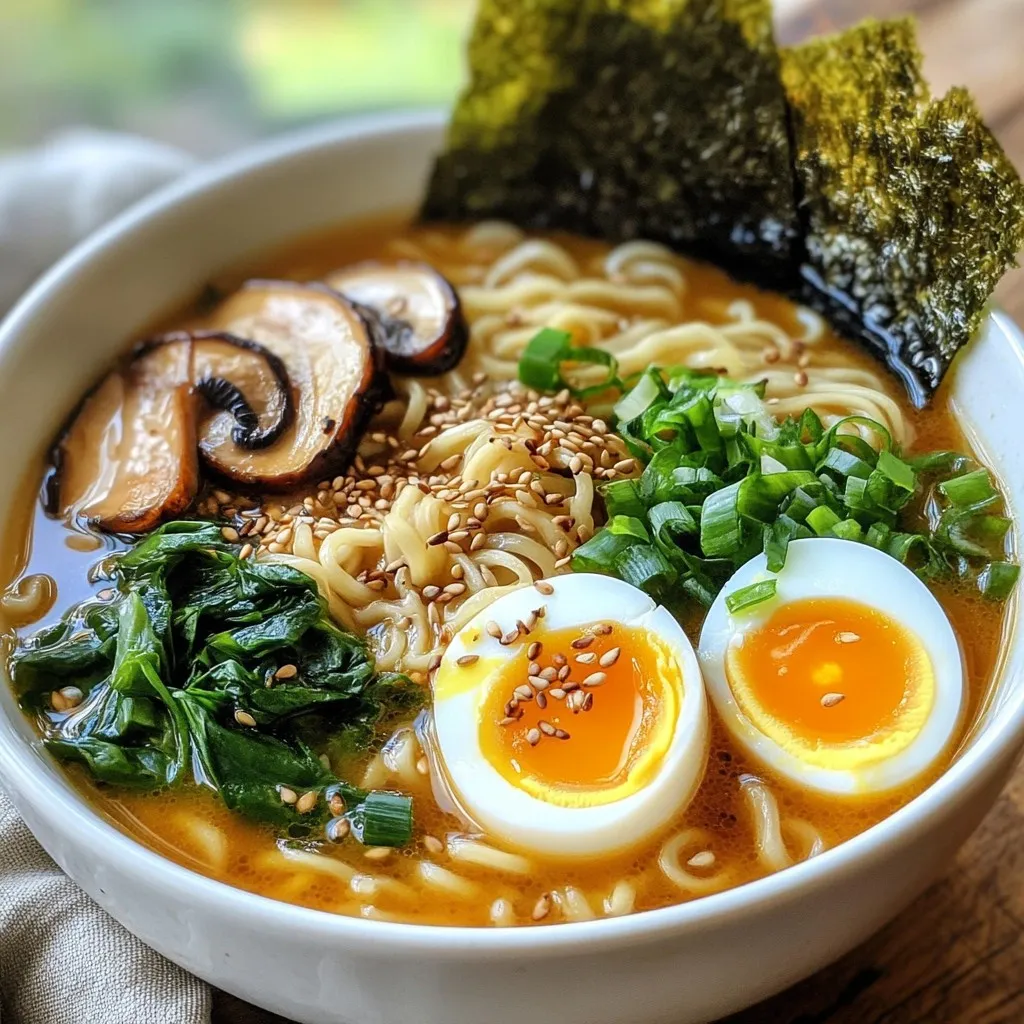 - Halbiere die weichgekochten Eier (wenn verwendet) und lege sie oben auf die Ramen. Garniere mit gehackten Frühlingszwiebeln, Sesamsamen und zerkleinerten Nori-Blättern.