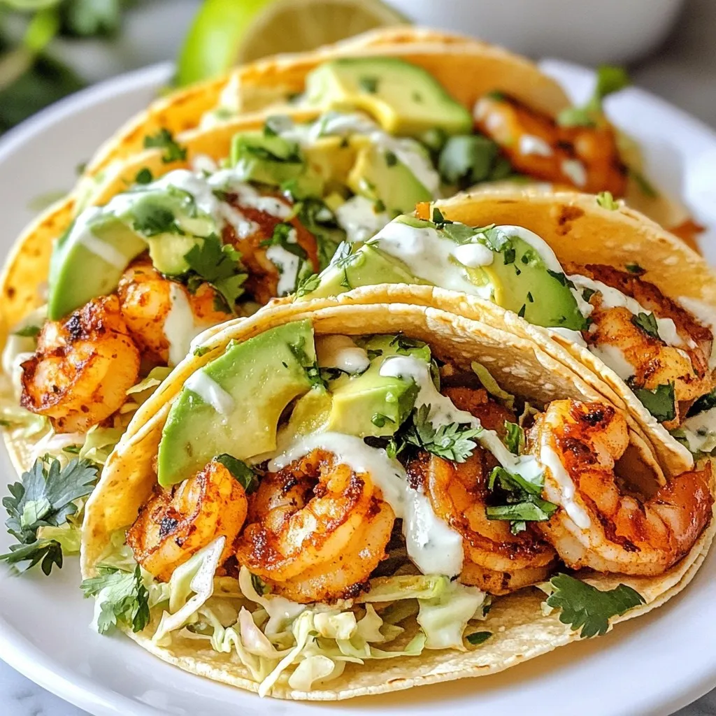 Leckere Tacos gefüllt mit gewürzten Garnelen, frischem Gemüse und einer cremigen Limetten-Sauce.