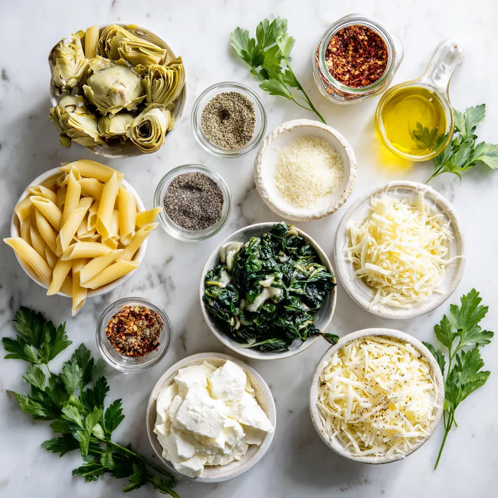 Die Pasta bildet die Basis des Gerichts. Ich empfehle Penne oder Fusilli, weil sie die Soße gut halten. Artischocken bringen einen einzigartigen Geschmack und eine zarte Textur. Frischer Spinat sorgt für Farbe und Nährstoffe. Frischkäse und Sauerrahm machen die Soße cremig und reichhaltig. Mozzarella und Parmesan geben einen köstlichen Käsegeschmack. Knoblauchpulver und Zwiebelpulver fügen Tiefe hinzu. Rote Pfefferflocken geben optional etwas Schärfe.