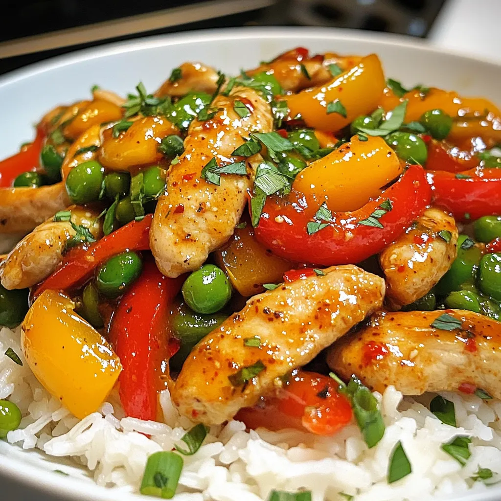 Ein schmackhaftes Pfannengericht mit Hähnchen, buntem Gemüse und einer süßen Chilisauce.