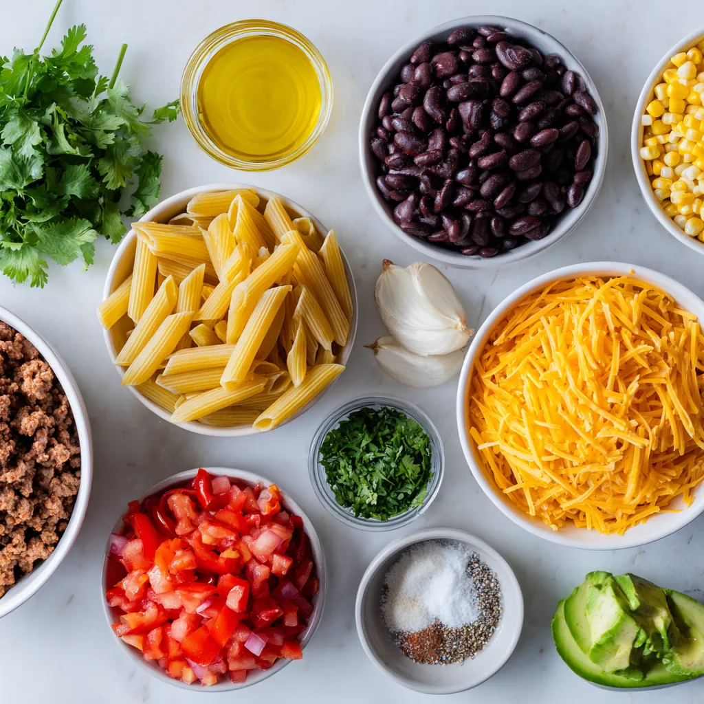 Für Taco Pasta benötigst du einige wichtige Zutaten. Diese bilden die Basis des Gerichts. Hier sind die Hauptzutaten: