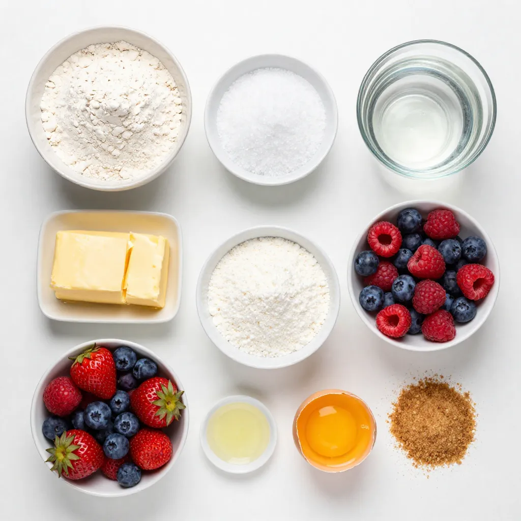 Die Hauptzutaten sind einfach und frisch. Weizenmehl ist die Basis für den Teig. Es gibt dem Teig Struktur und Halt. Ungezuckerte Butter macht den Teig reichhaltig und zart. Kalte Butter sorgt für die perfekte Textur. Gemischte Beeren bringen Farbe und Geschmack. Sie sorgen für die süße Füllung.