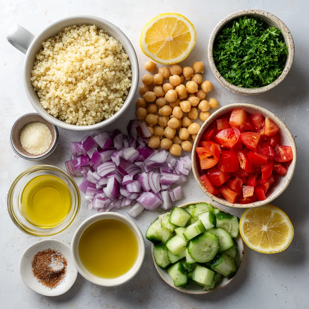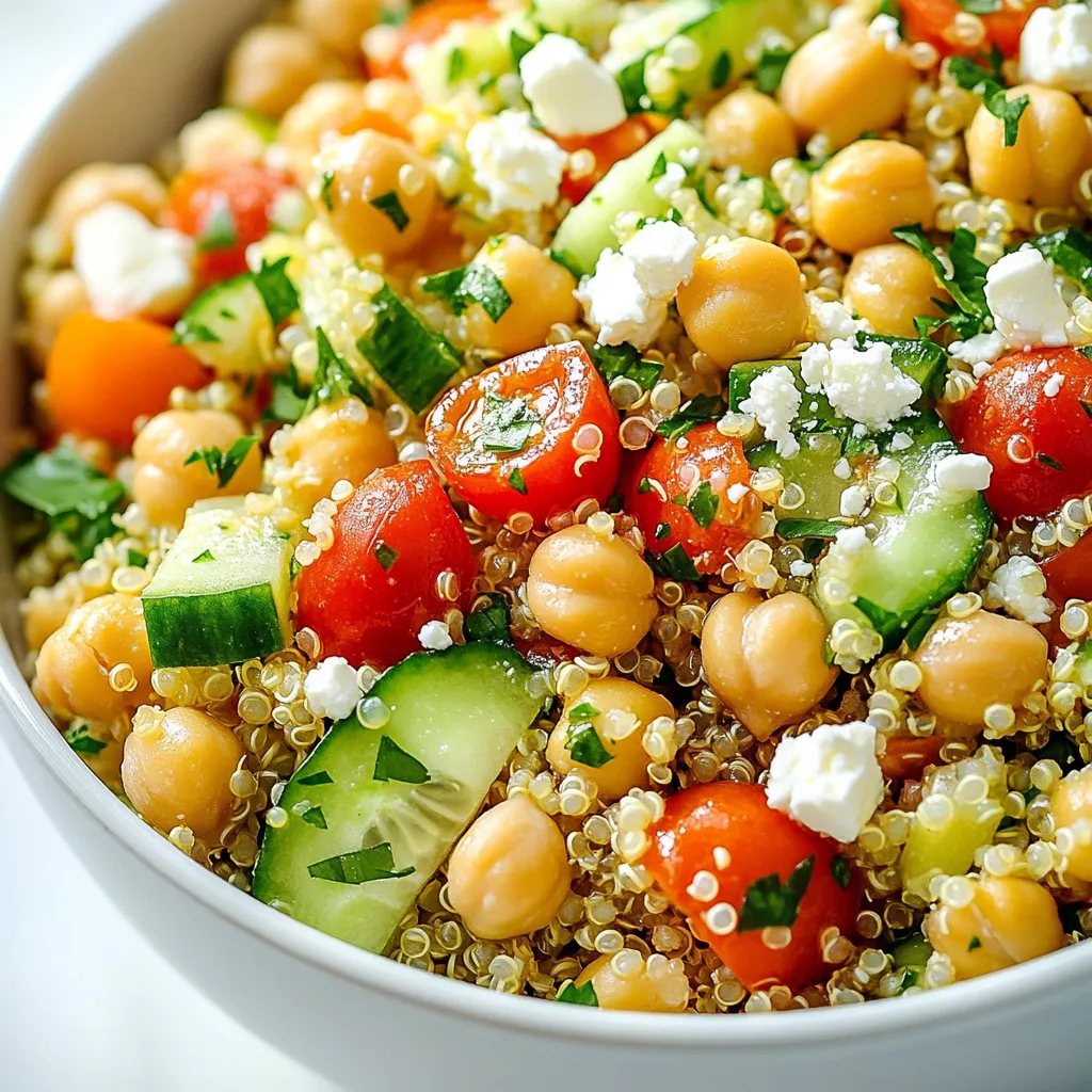 Dieser Salat bietet gesunde Zutaten wie Quinoa und Kichererbsen. Frisches Gemüse wie Tomaten und Gurken sorgt für Farbe und Geschmack. Das Dressing aus Zitronensaft und Gewürzen rundet alles ab.