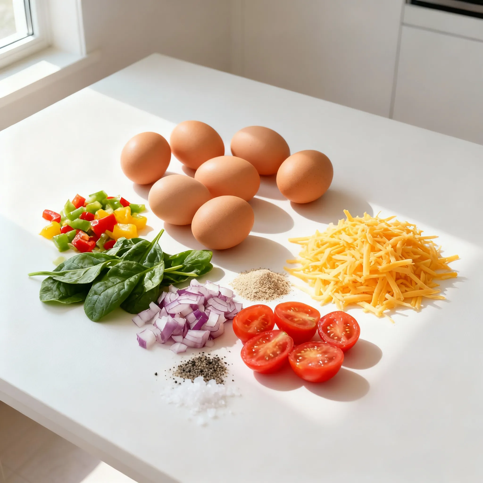 Schlage in einer großen Schüssel die 6 großen Eier auf. Verwende einen Schneebesen und vermische die Eier gut. Füge 1/4 Teelöffel Knoblauchpulver, 1/4 Teelöffel schwarzen Pfeffer und Salz hinzu. Rühre alles gut zusammen. Jetzt kommt der Spaß: Füge 1/2 Tasse fein gehackte Paprika, 1/2 Tasse grob gehackten Spinat, 1/4 Tasse fein gehackte rote Zwiebel und 1/4 Tasse halbierte Cherrytomaten hinzu. Mische alles gleichmäßig. Klappe 1/2 Tasse geriebenen Cheddar-Käse vorsichtig unter. So wird die Eimischung lecker und cremig.