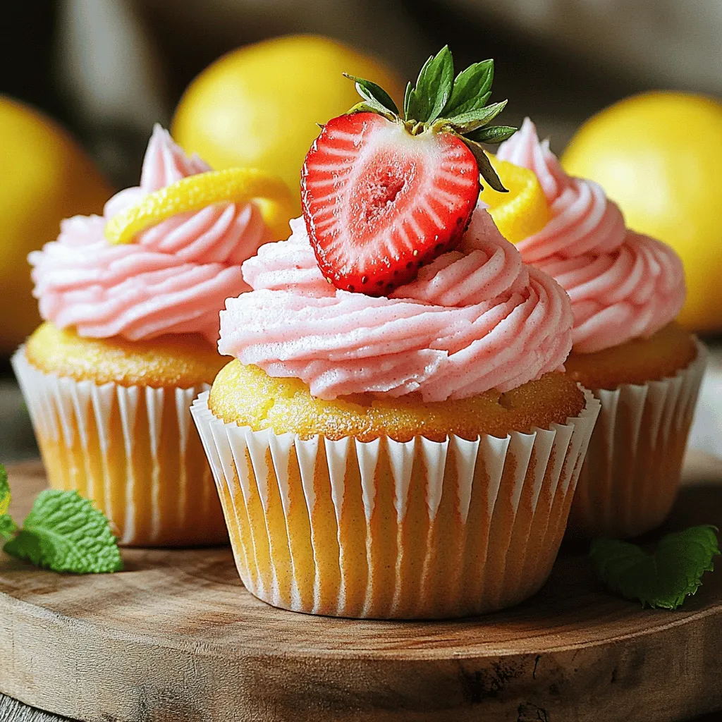- Präsentationstipps: Garnieren Sie jeden Cupcake mit einer Scheibe frischer Erdbeere und einem kleinen Zitronenschalen-Dreh für zusätzlichen Farbtupfer. Servieren Sie sie auf einer Platte mit ein paar frischen Minzblättern für einen erfrischenden Akzent.